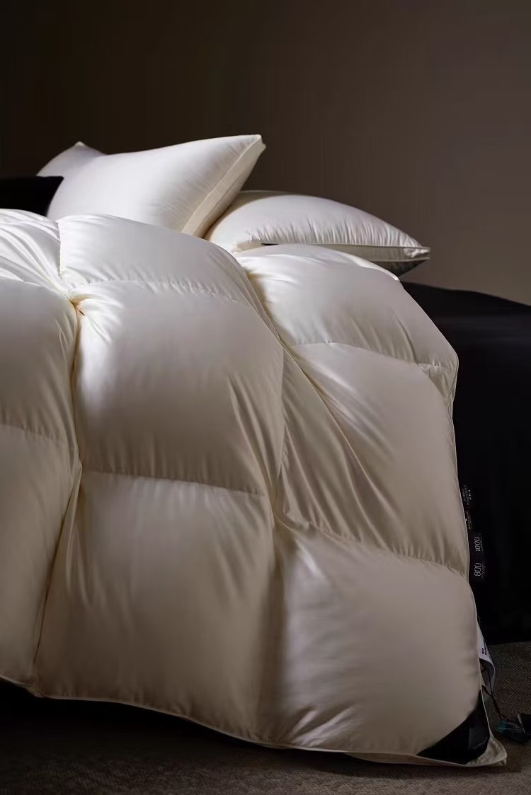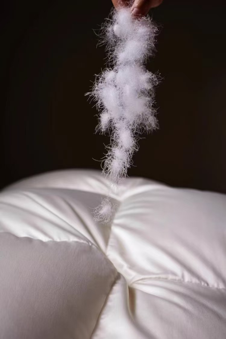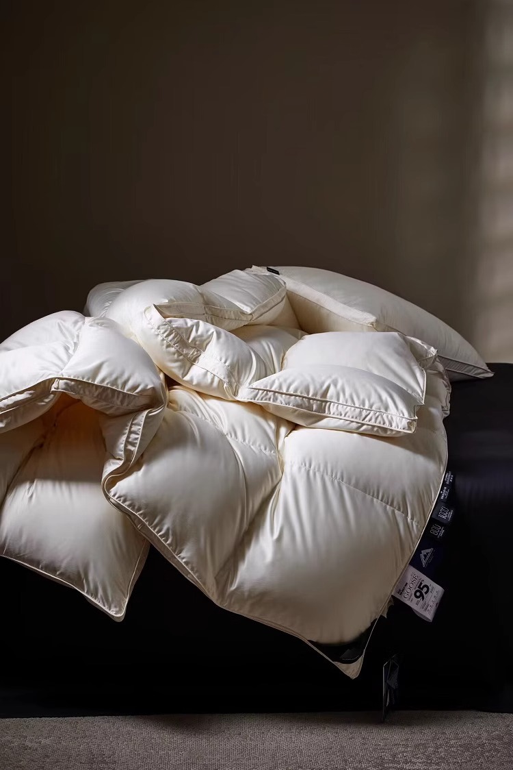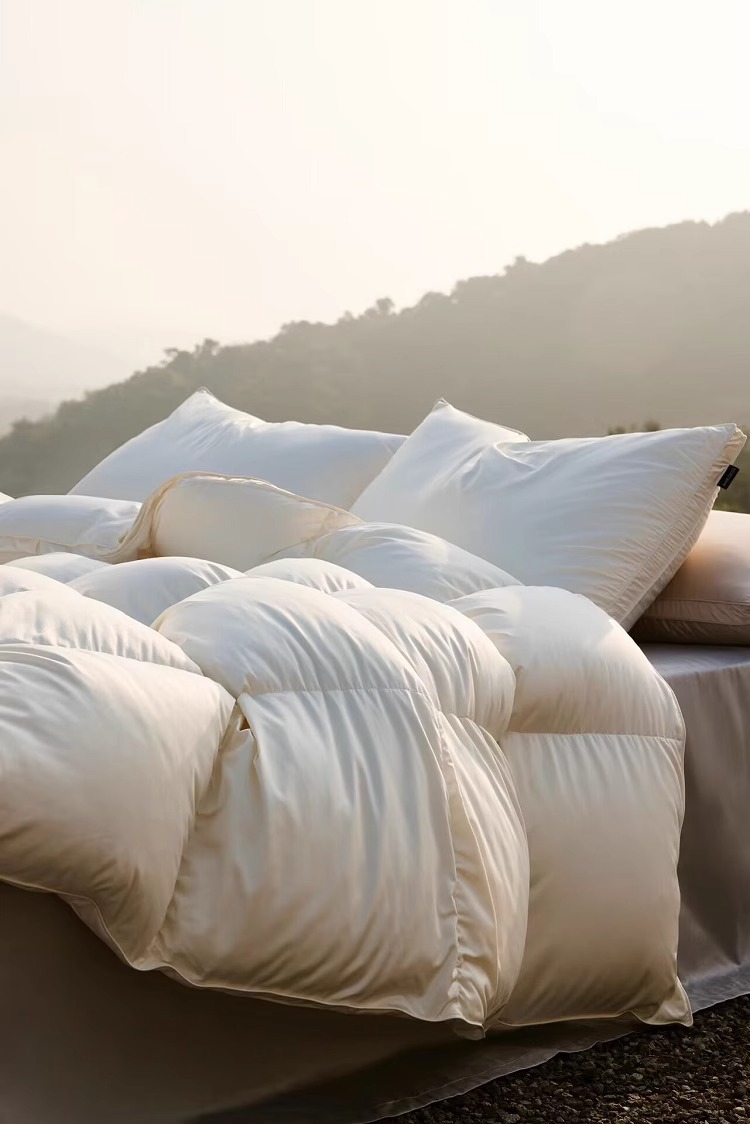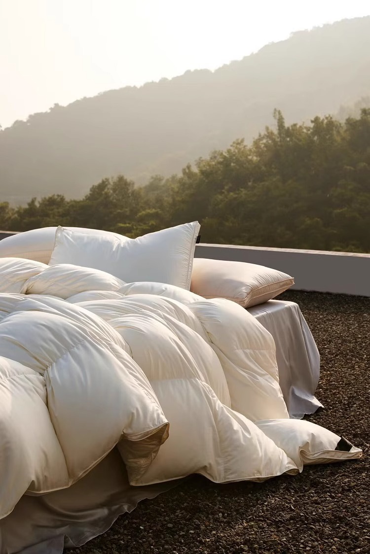 Each RoyalDown duvet undergoes a multi-stage cleaning process with a clarity rating over 1000 mm, ensuring it is free from dust, allergens, and residues, making it ideal for those seeking pure and hygienic sleep comfort. The outer casing features a premium dual-layer ultra-fine woven fiber, with an inner layer of 100% polyester and an outer surface of 95% Modal and 5% silk, providing a silky texture, excellent breathability, and a soft touch against the skin.
