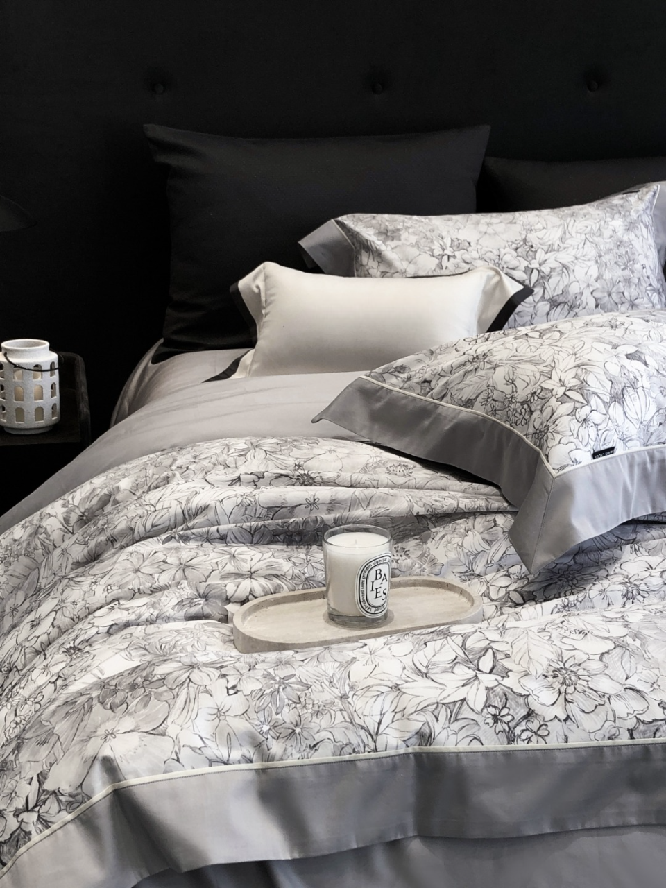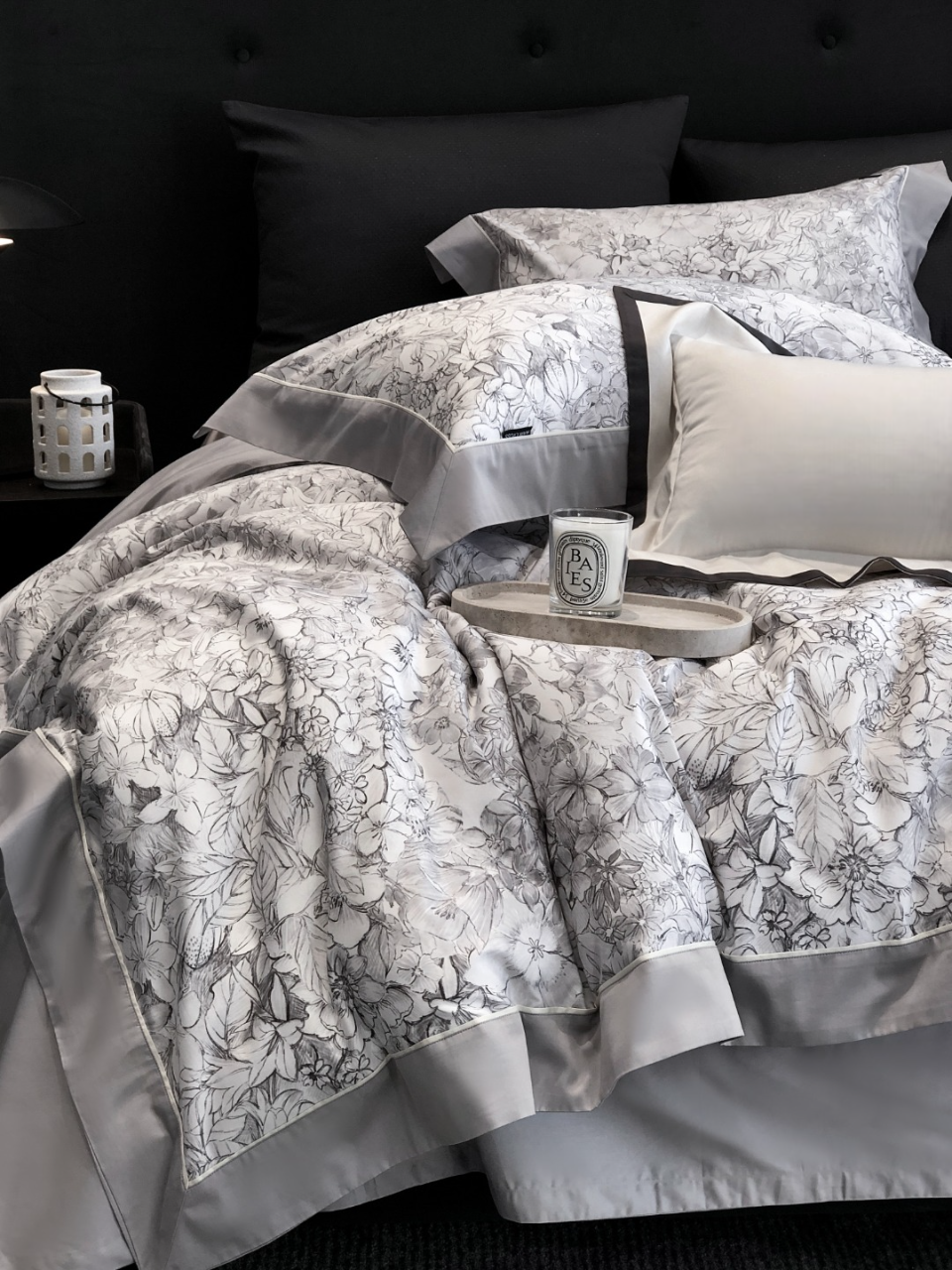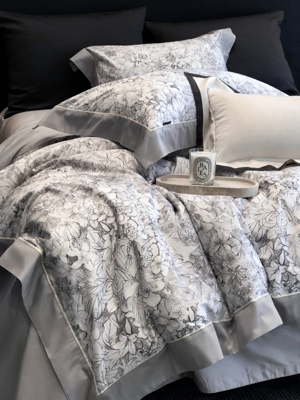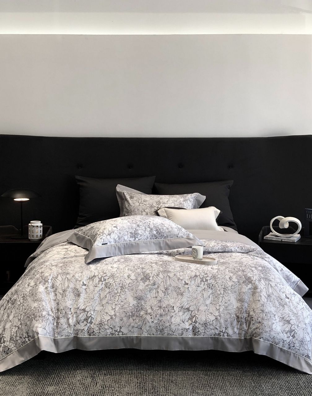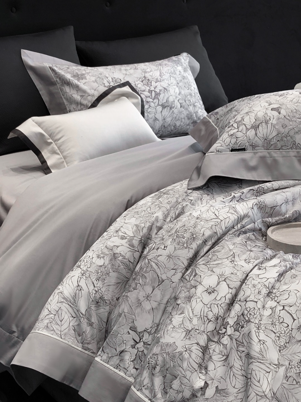 Trim & edging: Dove grey sateen. Sheet base: Soft mist grey