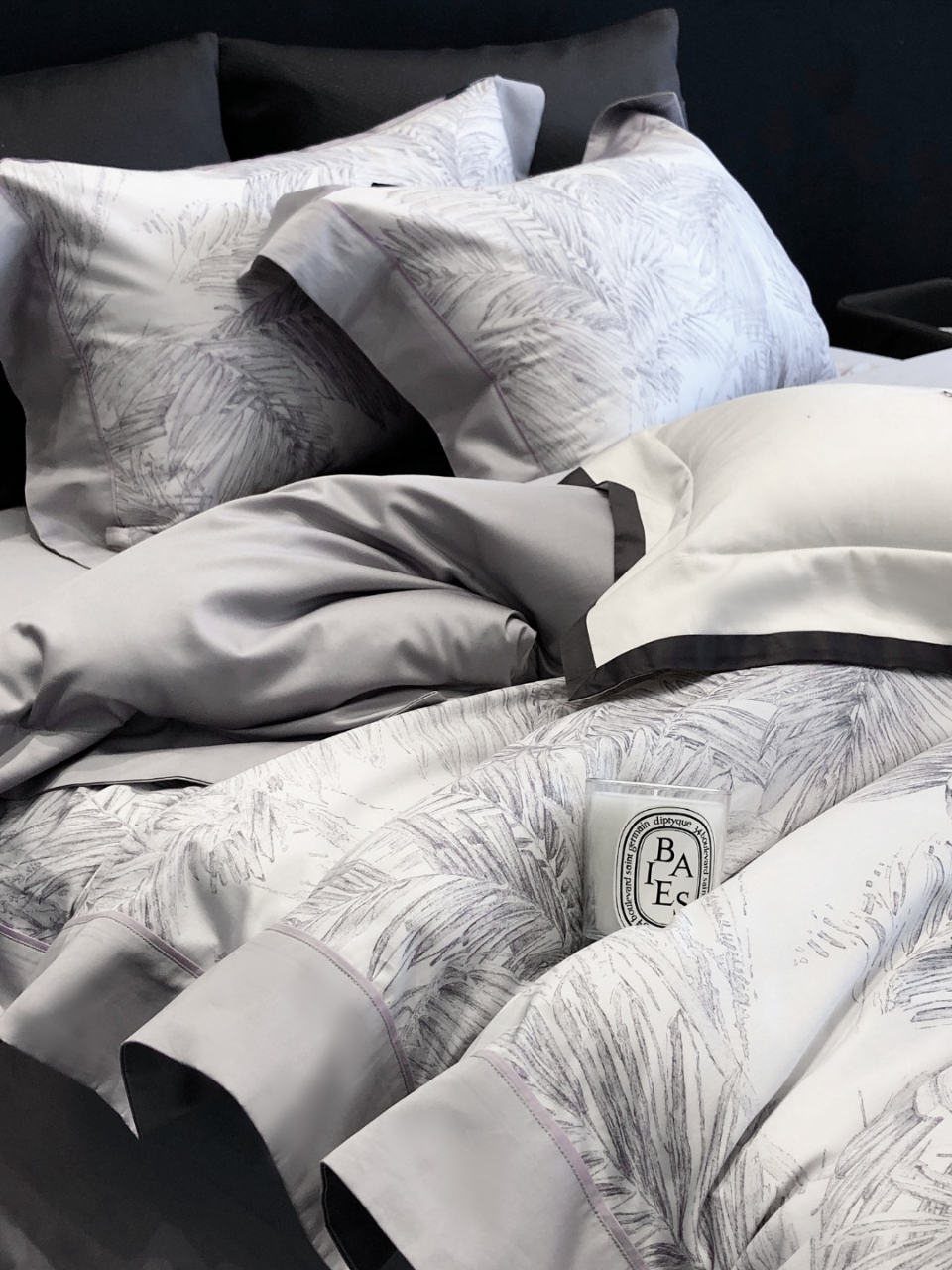 Trim & Edging: Cloud gray sateen. Sheet base: Soft smoky gray