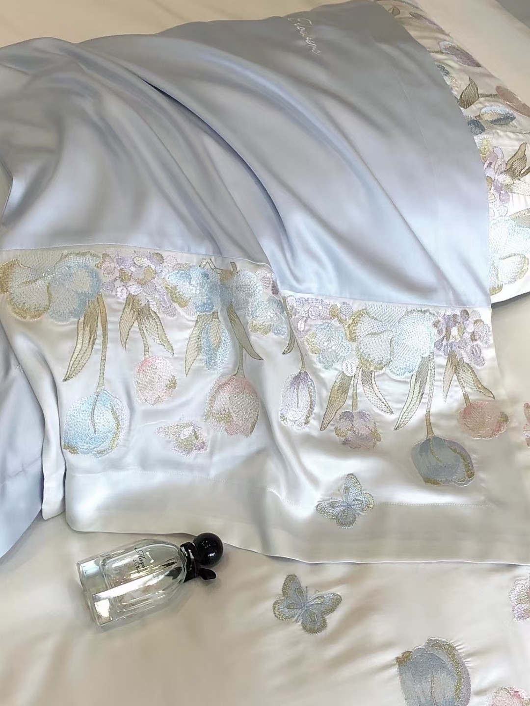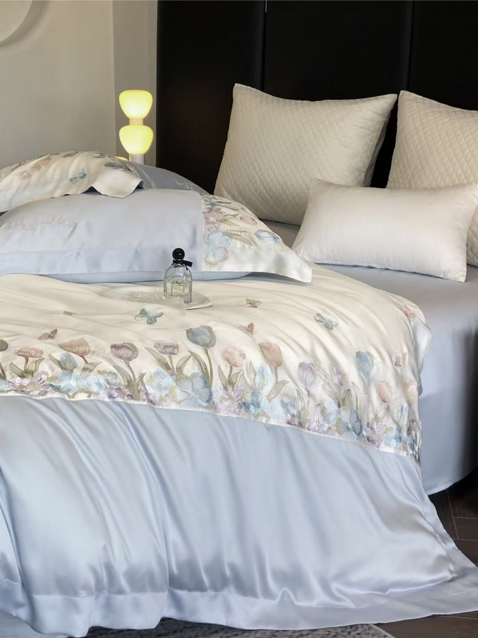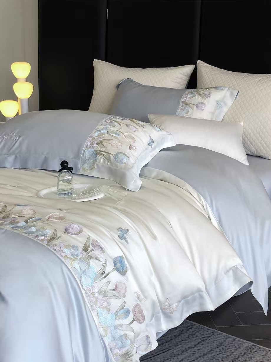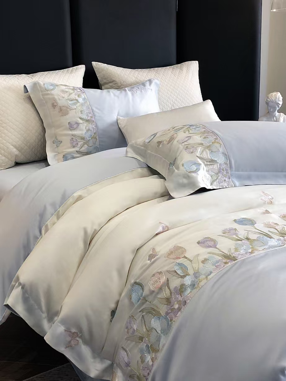 Soft florals and pure comfort meet elegance in this luxurious bedding set, featuring exquisitely embroidered floral patterns that exude romance and grace. Every detail evokes a sense of softness and tranquility, providing a lavish sleeping experience. Crafted from premium Australian cotton, it offers unparalleled comfort thanks to its soft fibers, superior elasticity, and excellent moisture absorption. Highly breathable and pleasantly warm, the fine fabric delivers a gentle, luxurious feel that transforms every night’s sleep into a refined sensory experience. Ideal for those seeking quality, comfort, and timeless elegance.