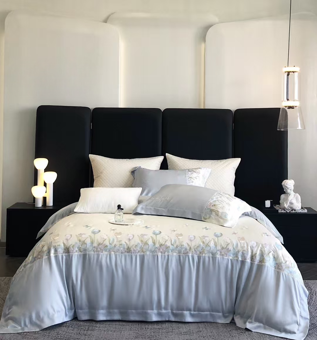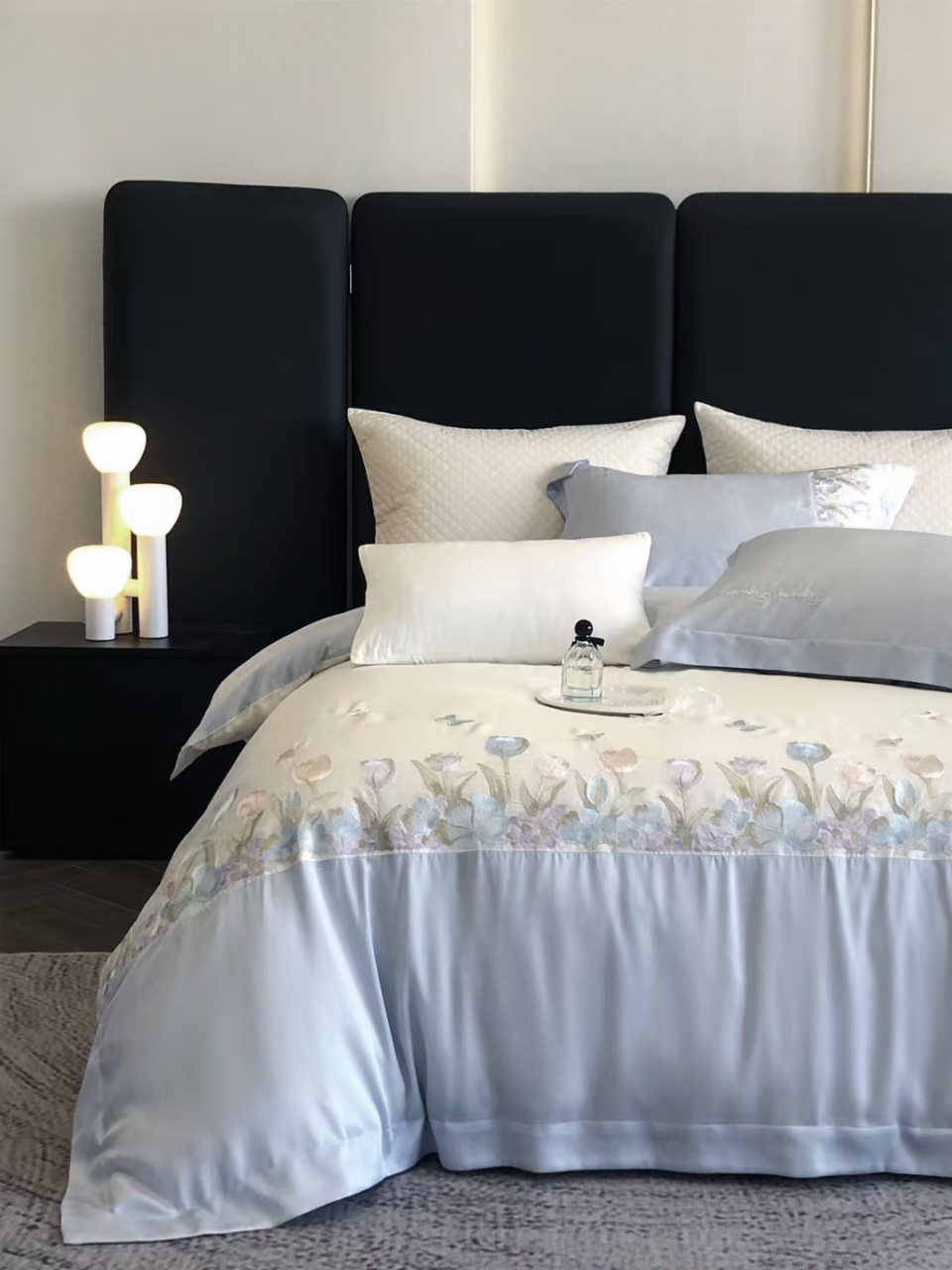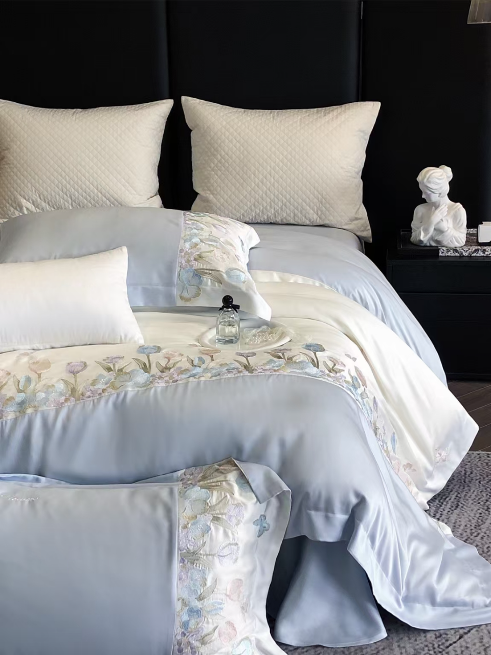 Soft florals and pure comfort meet elegance in this luxurious bedding set, featuring exquisitely embroidered floral patterns that exude romance and grace. Every detail evokes a sense of softness and tranquility, providing a lavish sleeping experience. Crafted from premium Australian cotton, it offers unparalleled comfort thanks to its soft fibers, superior elasticity, and excellent moisture absorption. Highly breathable and pleasantly warm, the fine fabric delivers a gentle, luxurious feel that transforms every night’s sleep into a refined sensory experience. Ideal for those seeking quality, comfort, and timeless elegance.