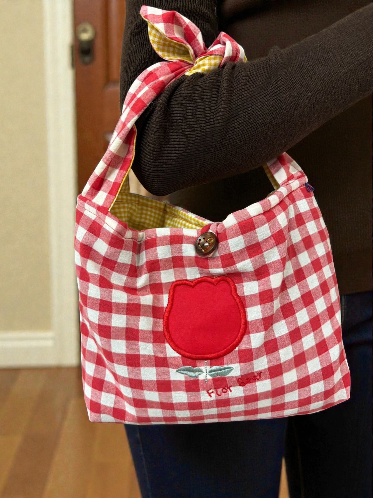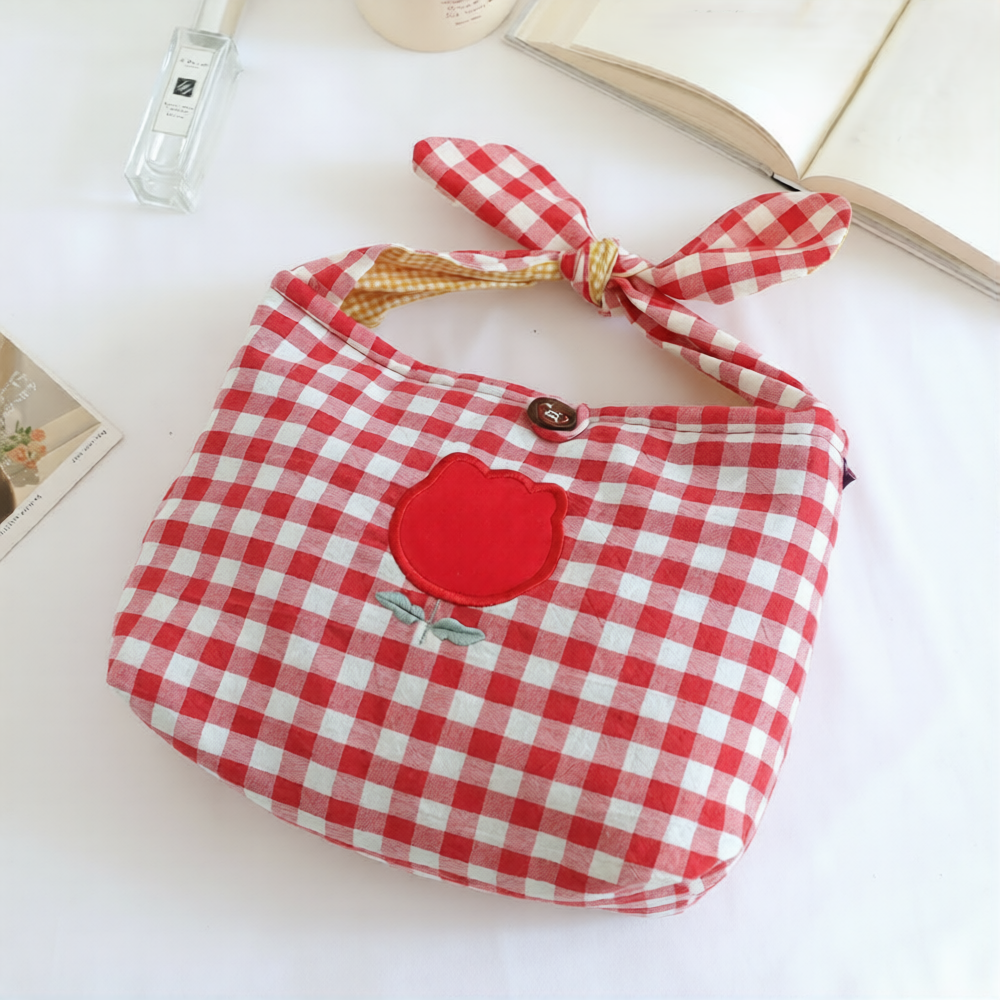 Βαμβακερή Τσάντα Χειρός με Φιόγκο & Κεντημένο Μήλο – Καρό κόκκινο
