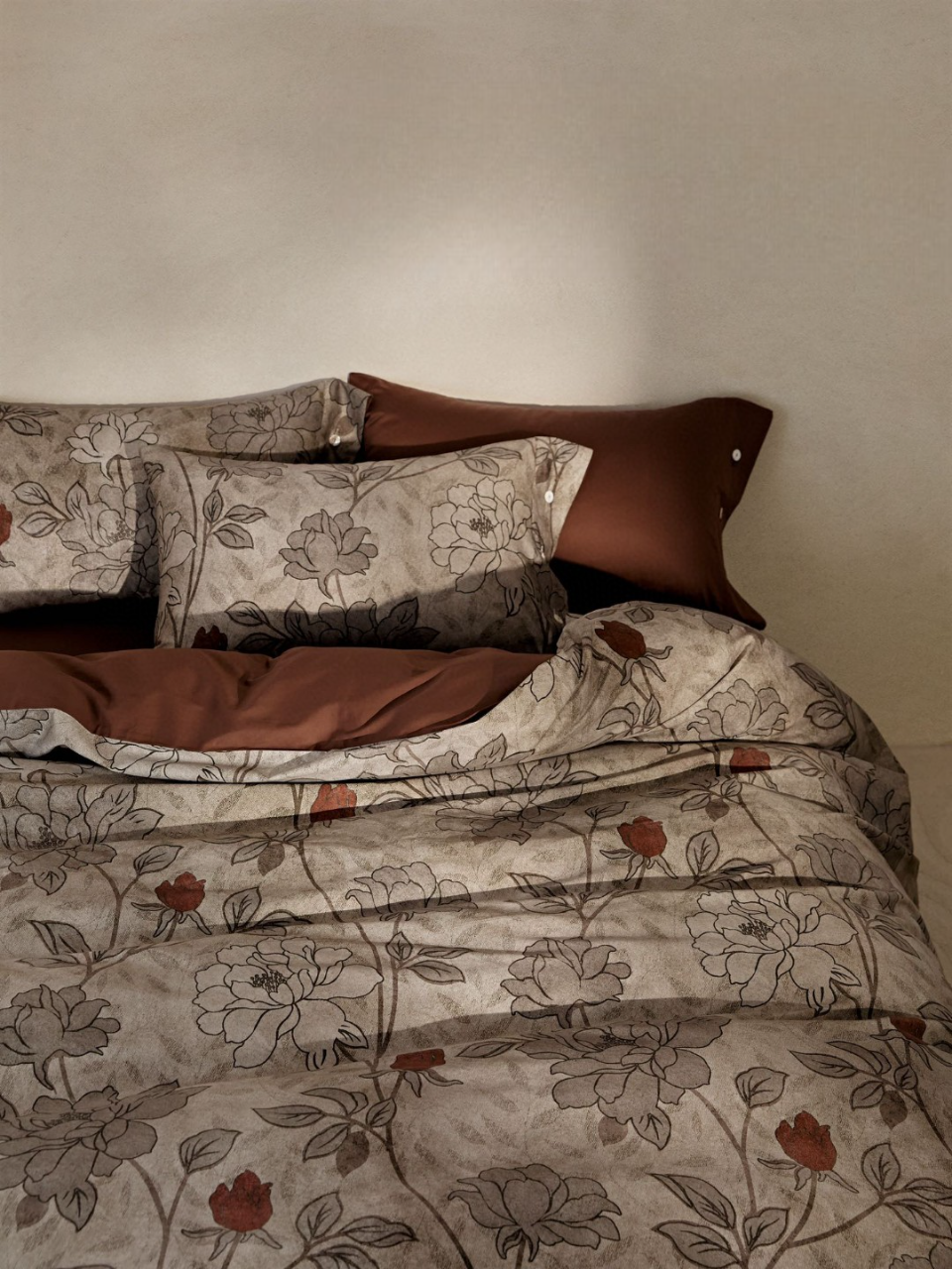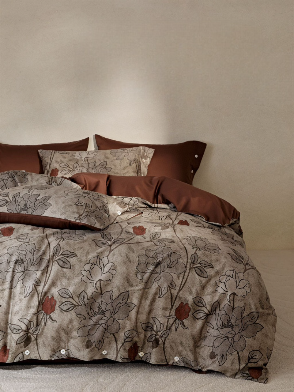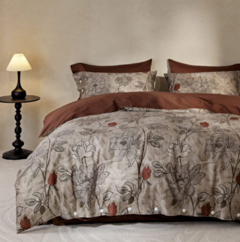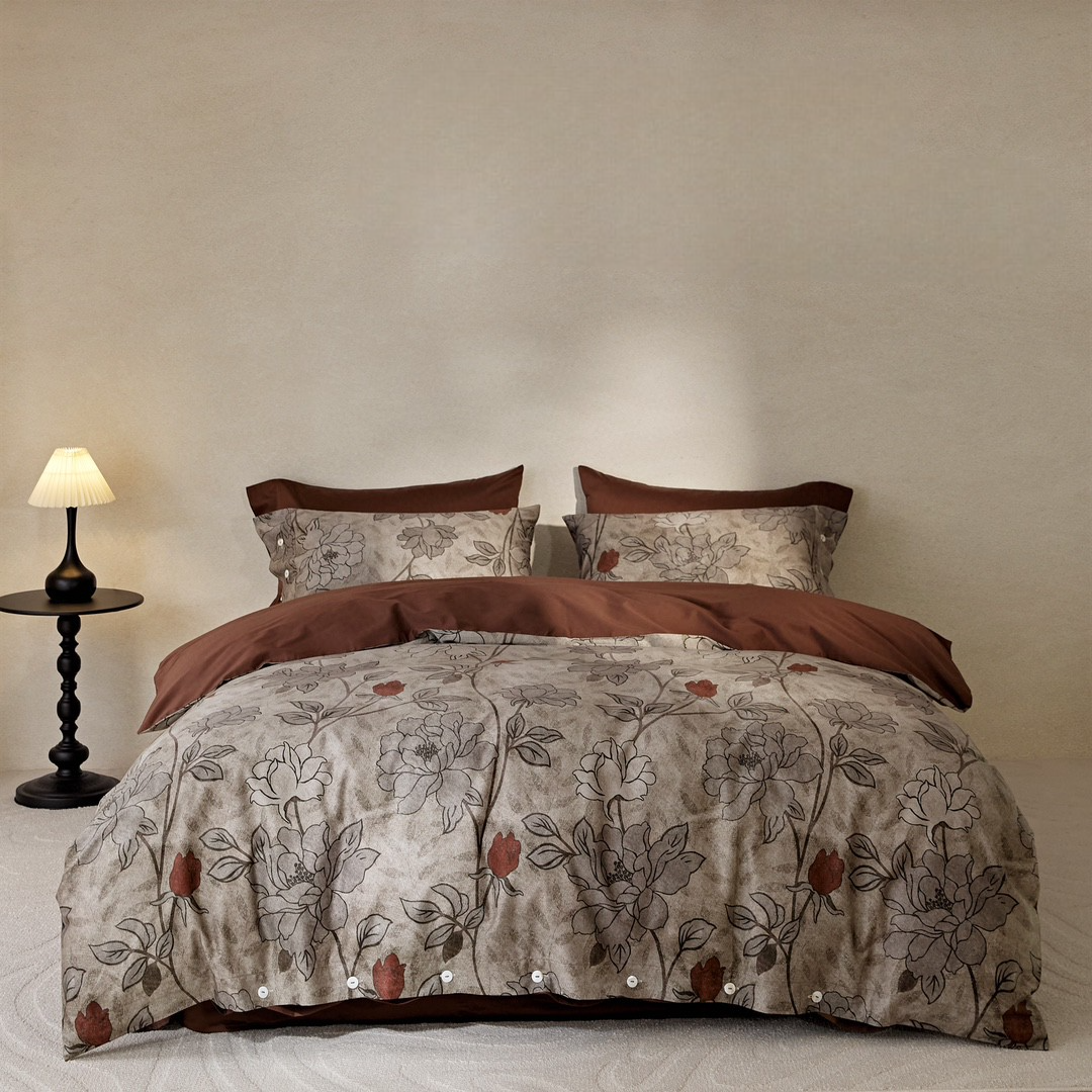 Οι ζεστές αποχρώσεις πηλού, σε συνδυασμό με χειροποίητα φλοράλ σχέδια σε ανάγλυφο γκρι χρώμα, δημιουργούν μια ήρεμη και κομψή ατμόσφαιρα. Το ύφασμα από 100% βαμβακοσατέν συνδυάζει εξαιρετική απαλότητα με υψηλή ανθεκτικότητα, ενώ η οικολογική ψηφιακή εκτύπωση διατηρεί τα χρώματα ζωντανά και αναλλοίωτα στον χρόνο.