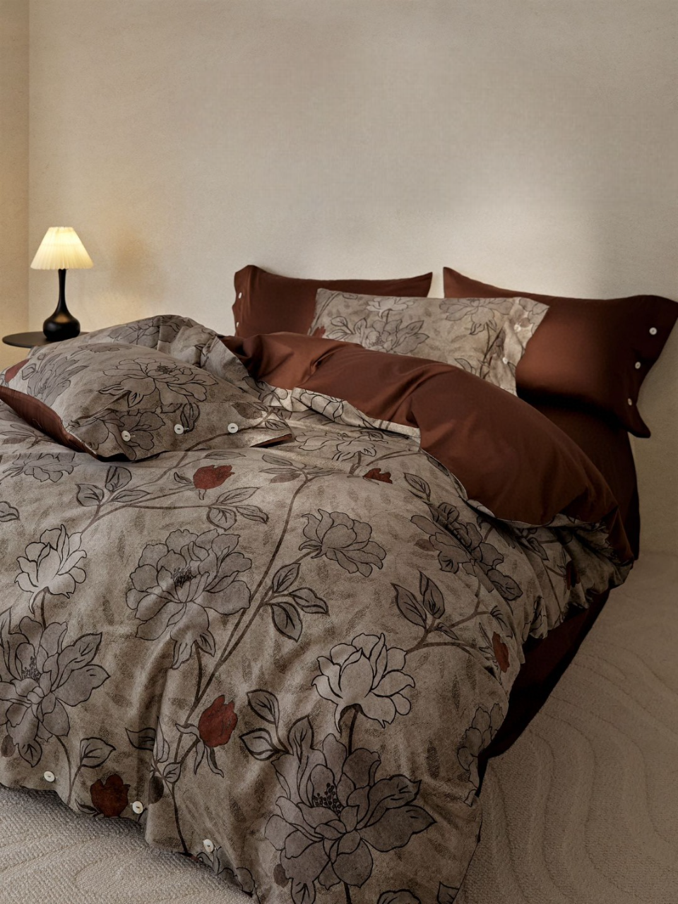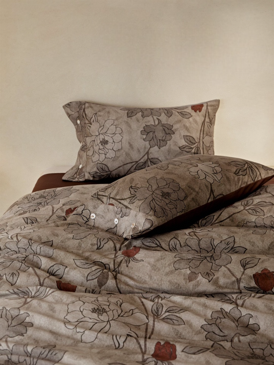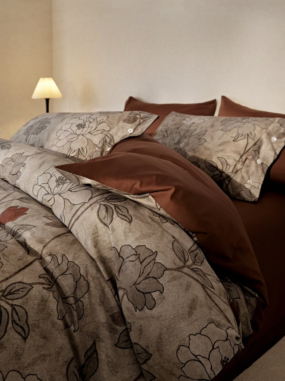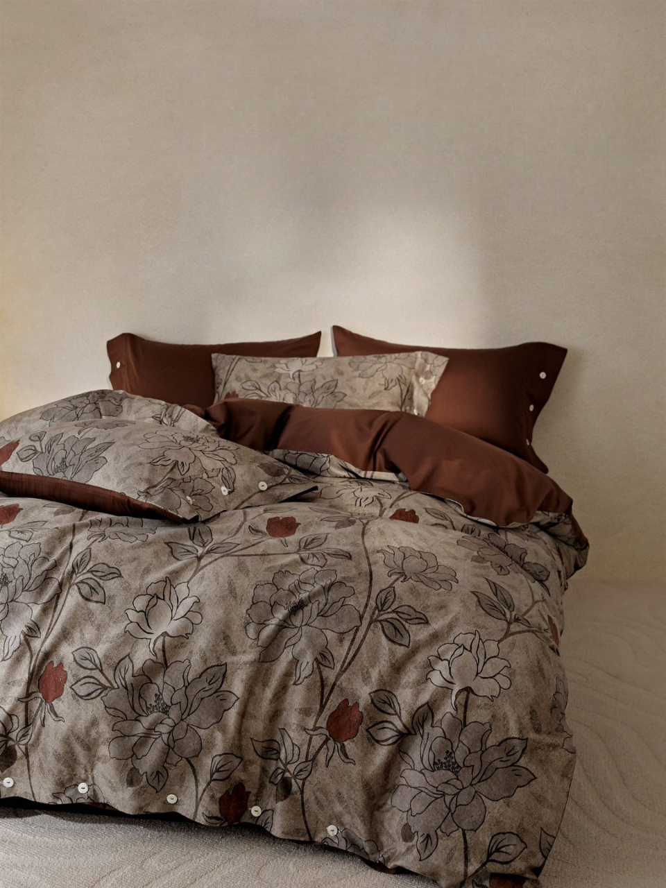 Οι ζεστές αποχρώσεις πηλού, σε συνδυασμό με χειροποίητα φλοράλ σχέδια σε ανάγλυφο γκρι χρώμα, δημιουργούν μια ήρεμη και κομψή ατμόσφαιρα. Το ύφασμα από 100% βαμβακοσατέν συνδυάζει εξαιρετική απαλότητα με υψηλή ανθεκτικότητα, ενώ η οικολογική ψηφιακή εκτύπωση διατηρεί τα χρώματα ζωντανά και αναλλοίωτα στον χρόνο.