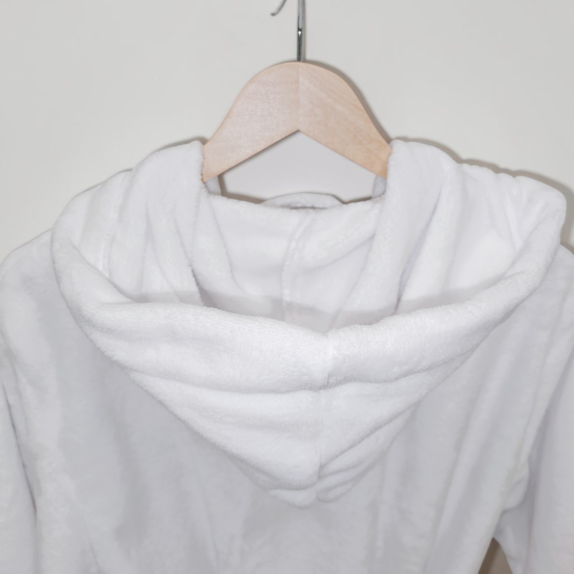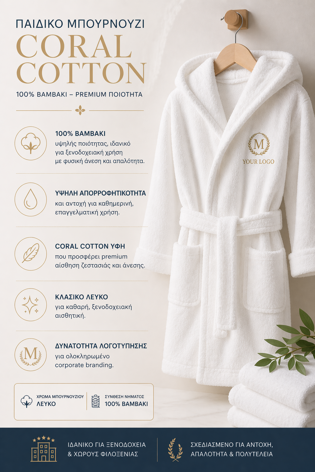 Μπουρνούζι παιδικό βαμβακερό ”γούνινο” Coral Cotton λευκό, unisex. Κατασκευασμένο από 100% βαμβάκι υψηλής ποιότητας, με γιακά σάλι και κουκούλα για μέγιστη άνεση και ζεστασιά.